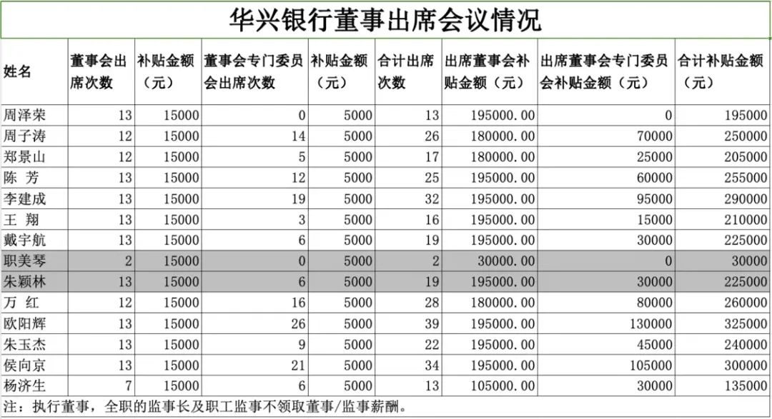 凤凰网财经《银行财眼》注意到,华兴银行董事会和董事会各专门委员会的出席率极高,分别达到了99.39%和99.3%。其中,陈芳、李建成、王翔、戴宇航、欧阳辉、朱玉杰、侯向京等7位董事(包含独董)同董事长周泽荣一样13次董事会全勤,均可以领到195000元会议补贴。