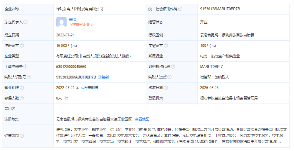 禄劝东电太阳能发电有限公司成立于2022年7月21日,法定代表人:辛浩,注册资本1.6803亿元。