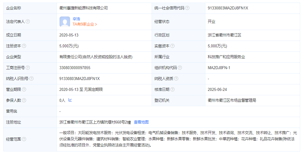衢州惠捷新能源科技有限公司成立于2020年5月13日,法定代表人:辛浩,注册资本5000万元,
