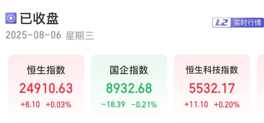 上证报中国证券网讯(刘禹希 记者 严晓菲)8月6日,港股三大指数涨跌互现。截至收盘,恒生指数涨0.03%,报24910.63点;恒生国企指数跌0.21%,报8932.68点;恒生科技指数涨0.20%,报5532.17点。